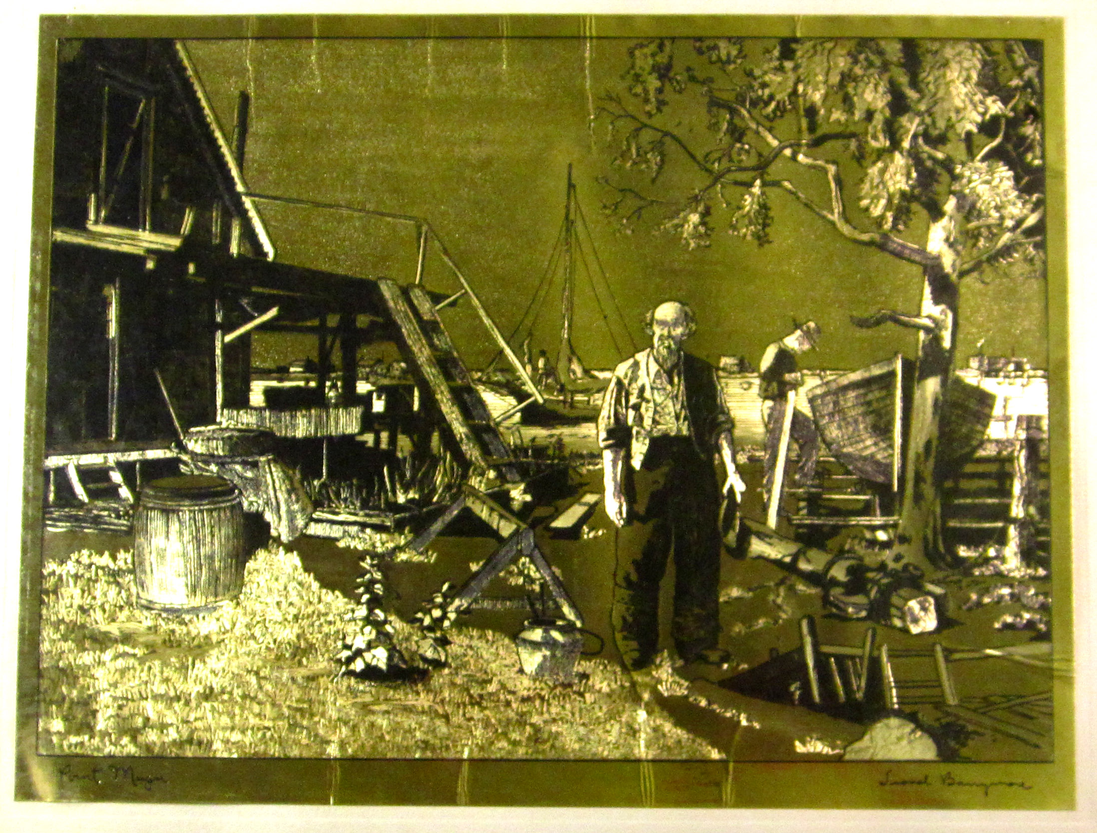 Framed gold etching of Point Mugu by Lionel Barrymore.