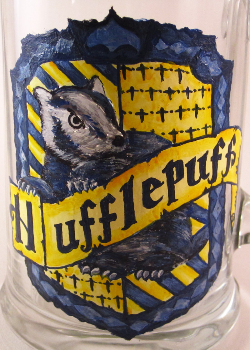 Hufflepuff Crest Beer Mug hand-painted by an artist in the Northern Panhandle of West Virginia for a wedding. (leftover item)